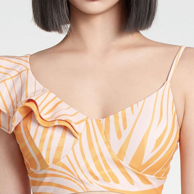 夏のビーチやプールで映える、オレンジのアシンメトリーショルダーがキレイなセパレート水着です。